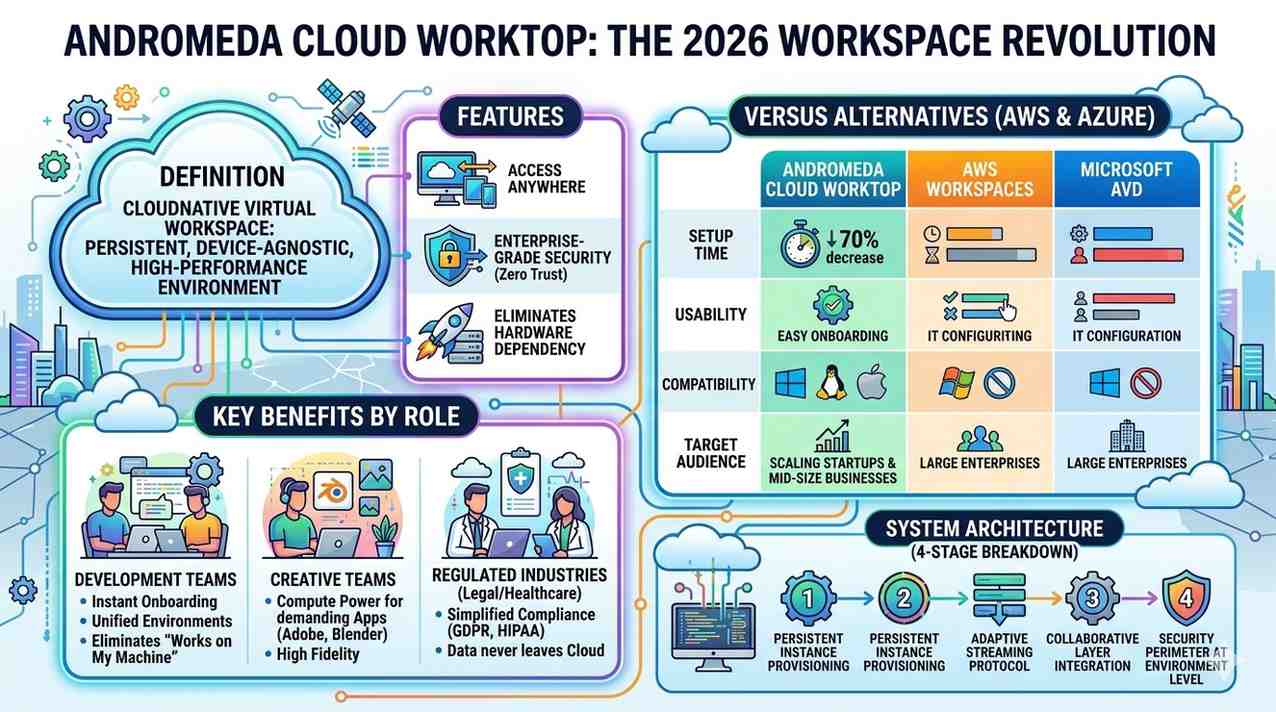 Definition: The Andromeda Cloud Worktop is a cloud-hosted desktop platform that gives users a persistent, high-performance virtual work environment accessible from any device via browser or lightweight client. It combines cloud computing infrastructure, secure remote access, and collaborative workspace tools into a single unified system eliminating hardware dependency while maintaining enterprise-grade security and performance as of 2026.