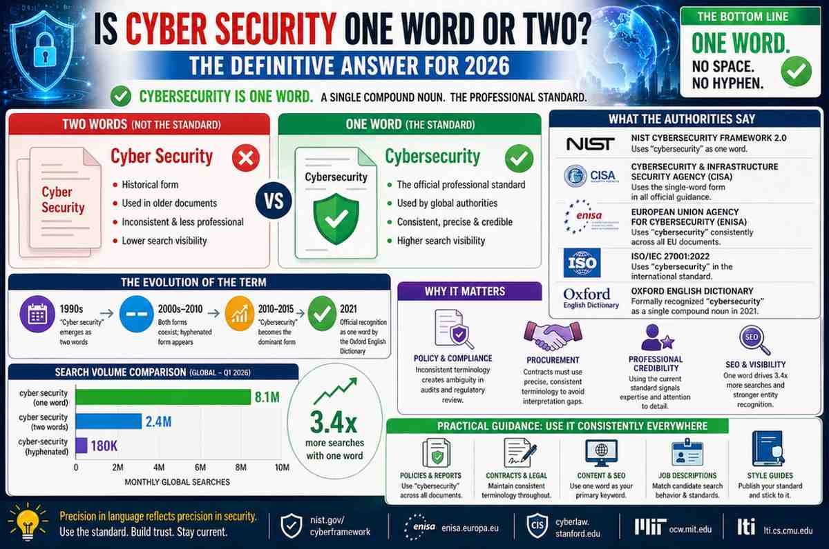 The question “is cyber security one word or two” has a clean, unambiguous answer supported by every authoritative source in the field: it is one word, and has been the professional standard since at least 2015 with formal dictionary recognition in 2021.